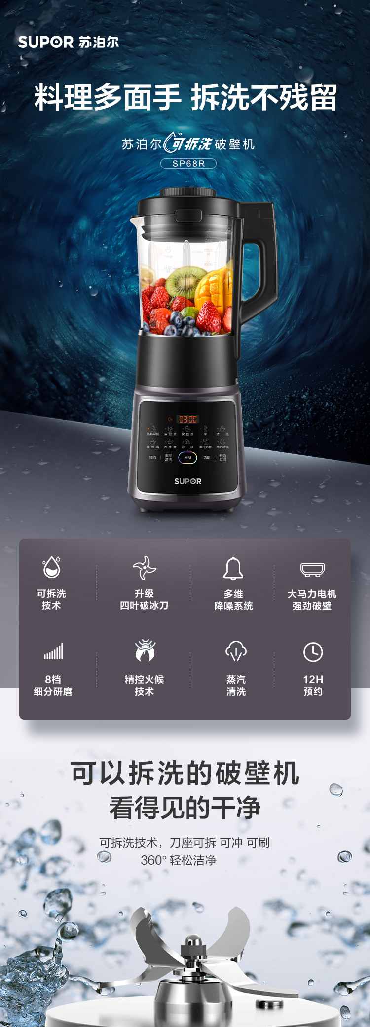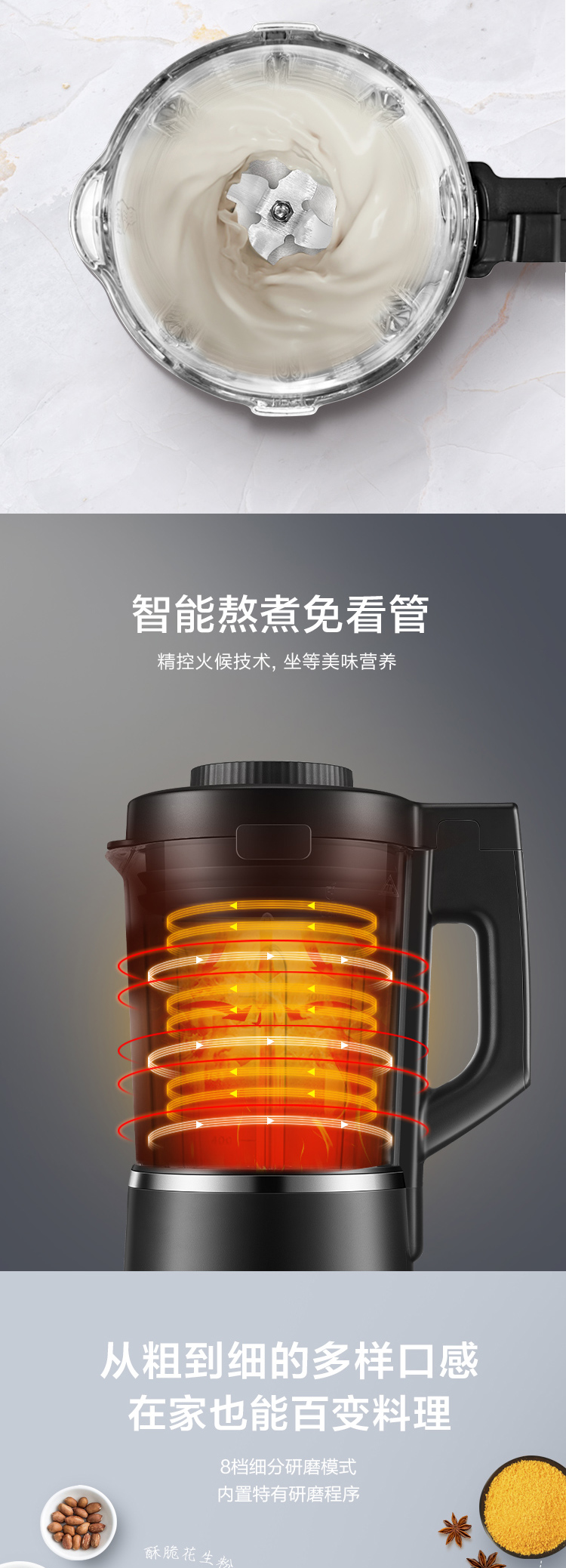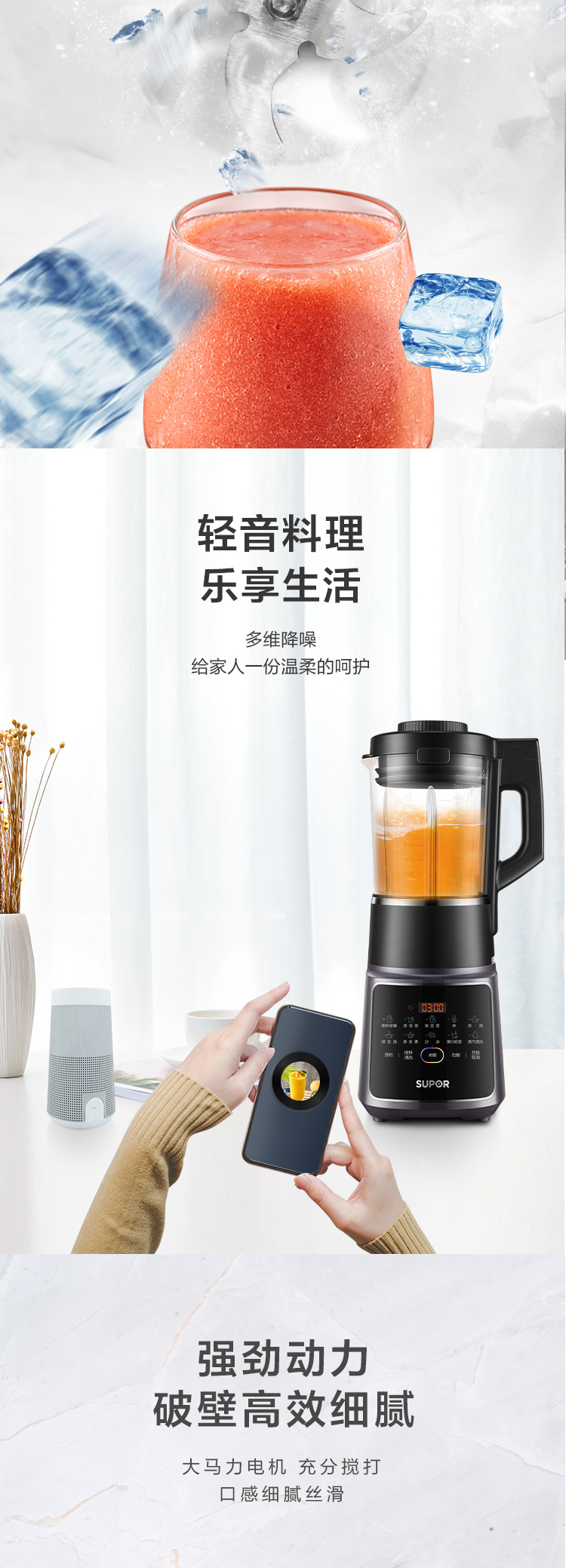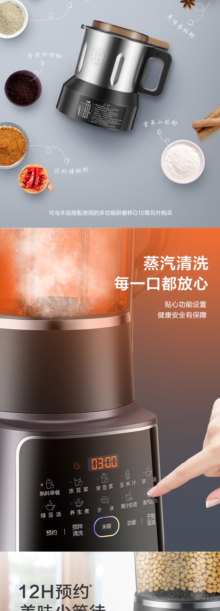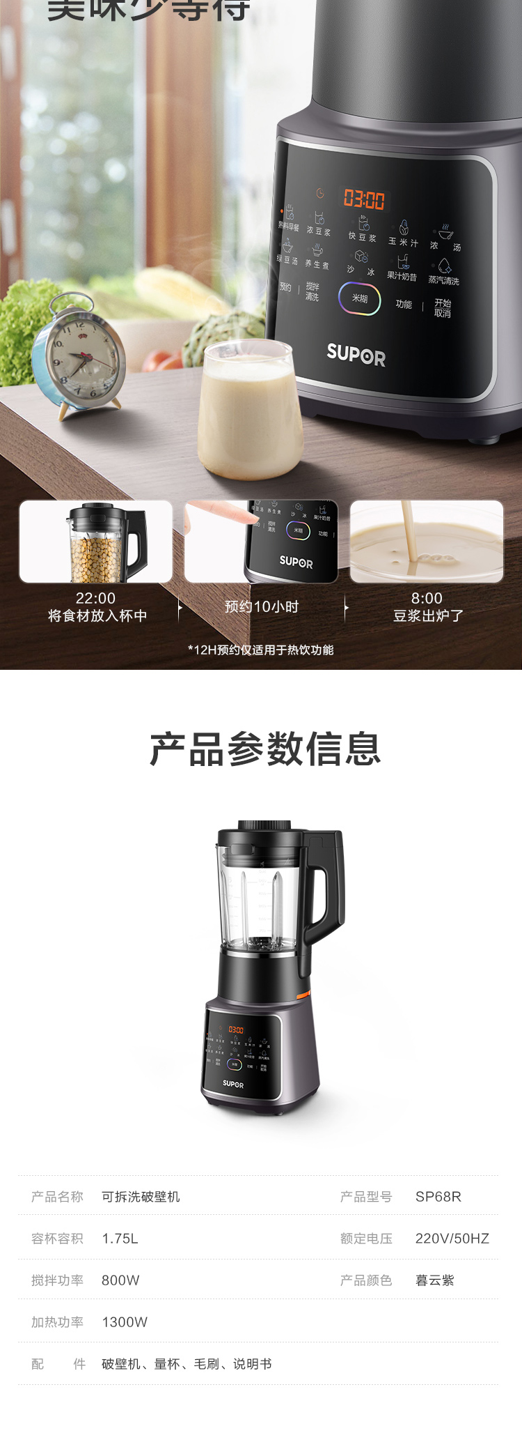 功能:熟料早餐、濃豆?jié){、快豆?jié){、玉米汁、濃湯、綠豆湯、養(yǎng)生煮、沙冰、果汁奶昔、蒸汽清洗、預(yù)約、攪拌清洗、米糊