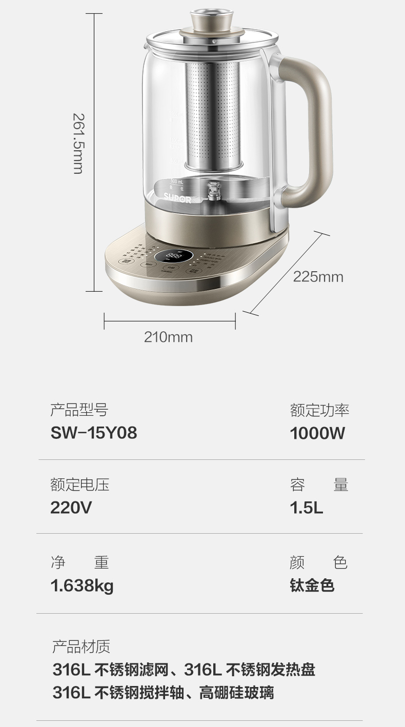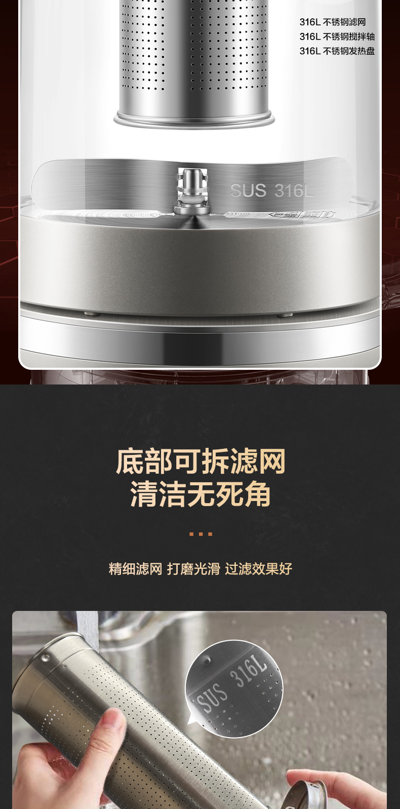 材質: 316L不銹鋼濾網(wǎng)、316L不銹鋼發(fā)熱盤,316L不銹鋼攪拌軸、高硼硅壺身