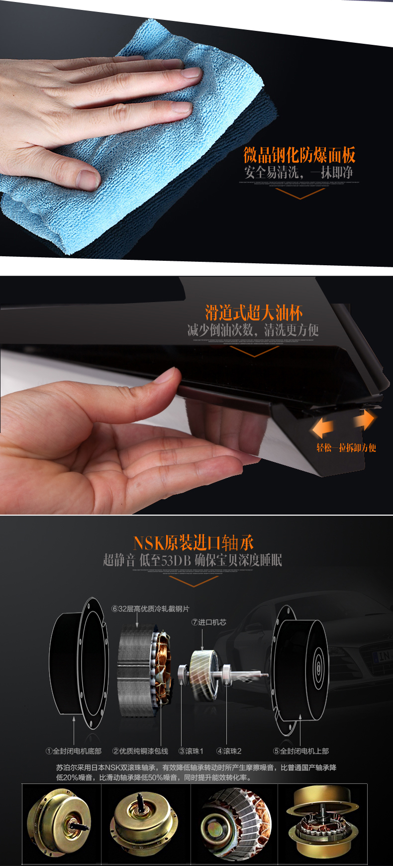 材質(zhì):黑晶鋼化玻璃 功能:側(cè)吸式 排風(fēng)量:16m3/min 噪音:≤53dB 操控:觸摸式 外形尺寸:900*370*830mm
