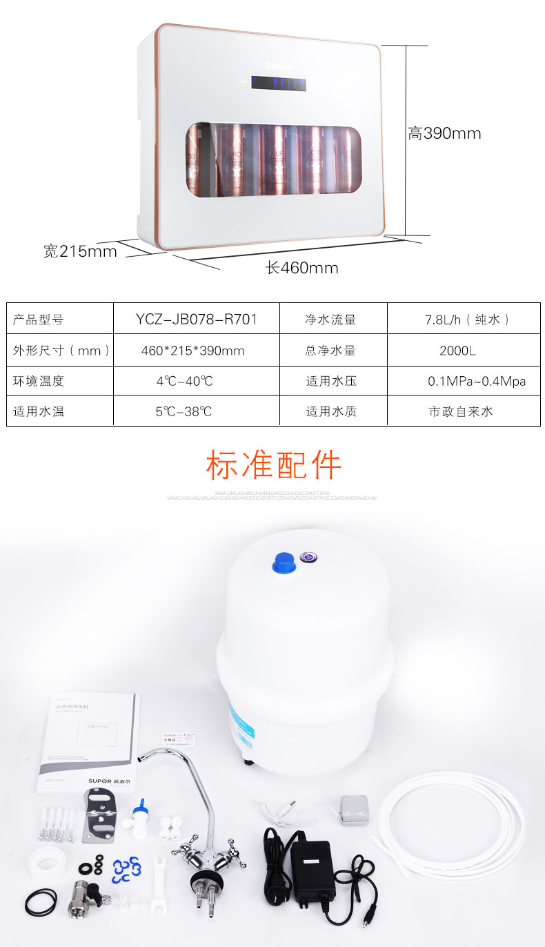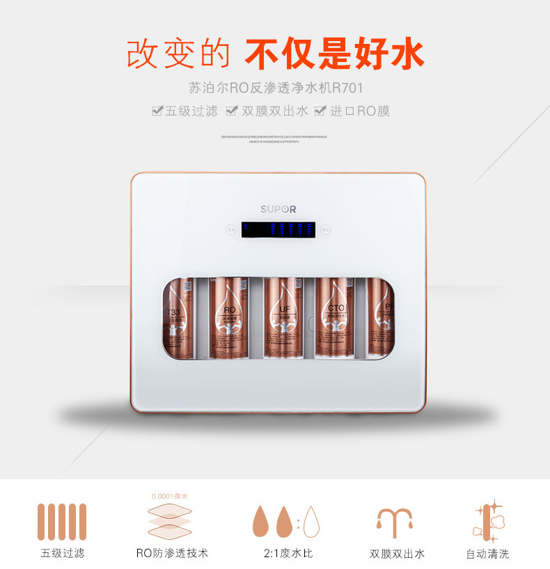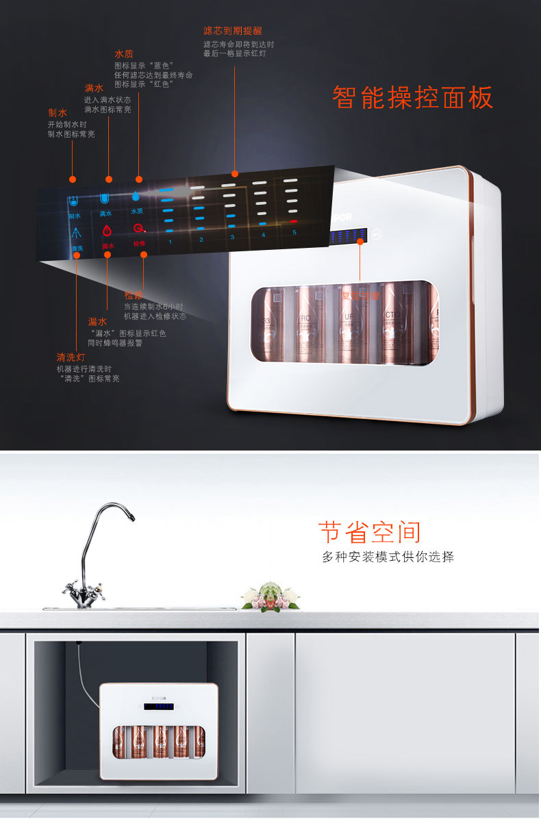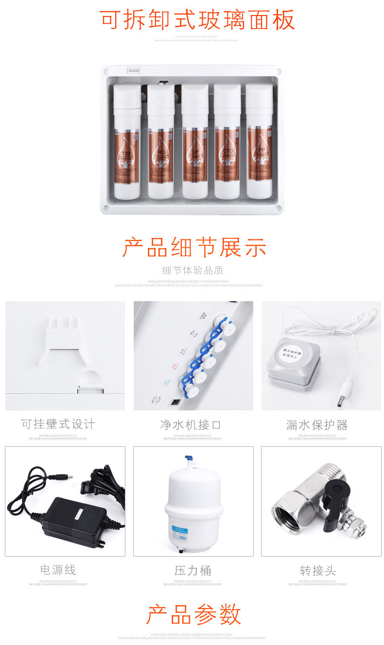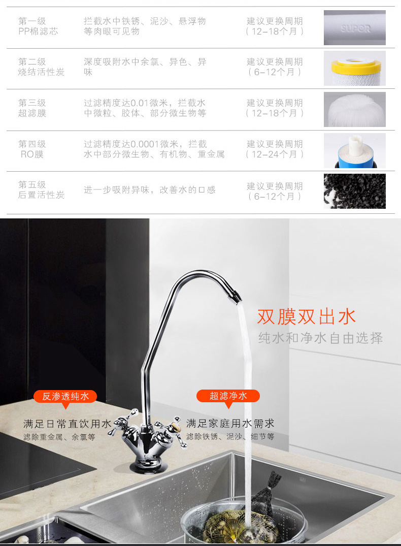 濾芯:PP棉+CTO燒結活性炭+UF超濾膜+RO反滲透膜+T33后置活性炭濾
