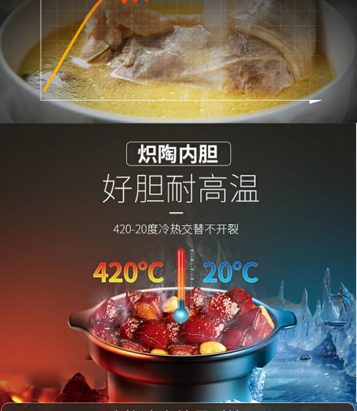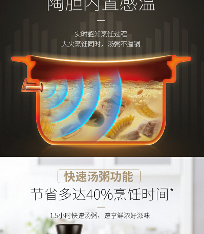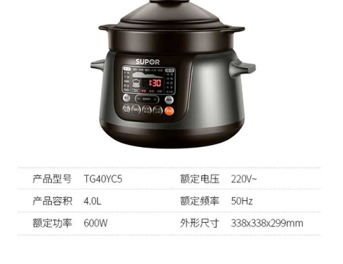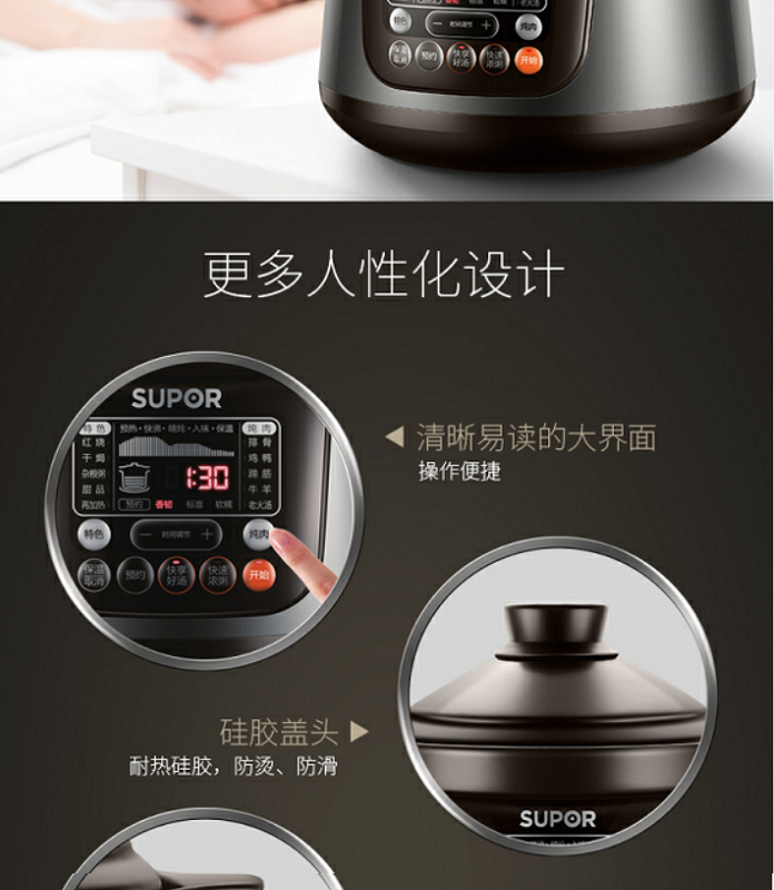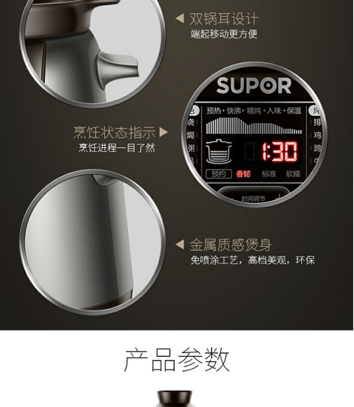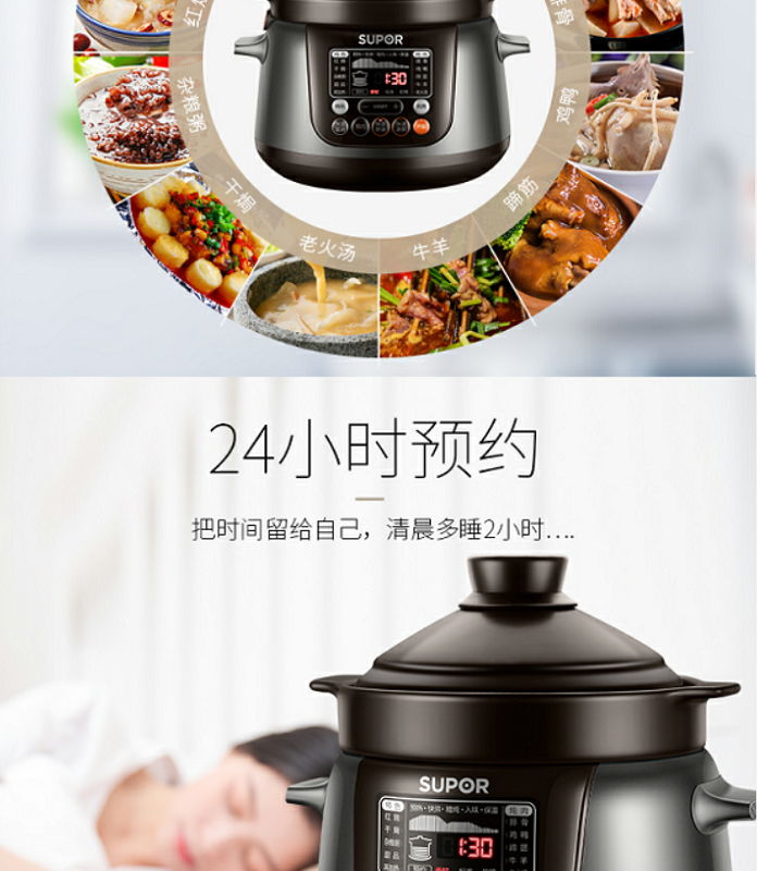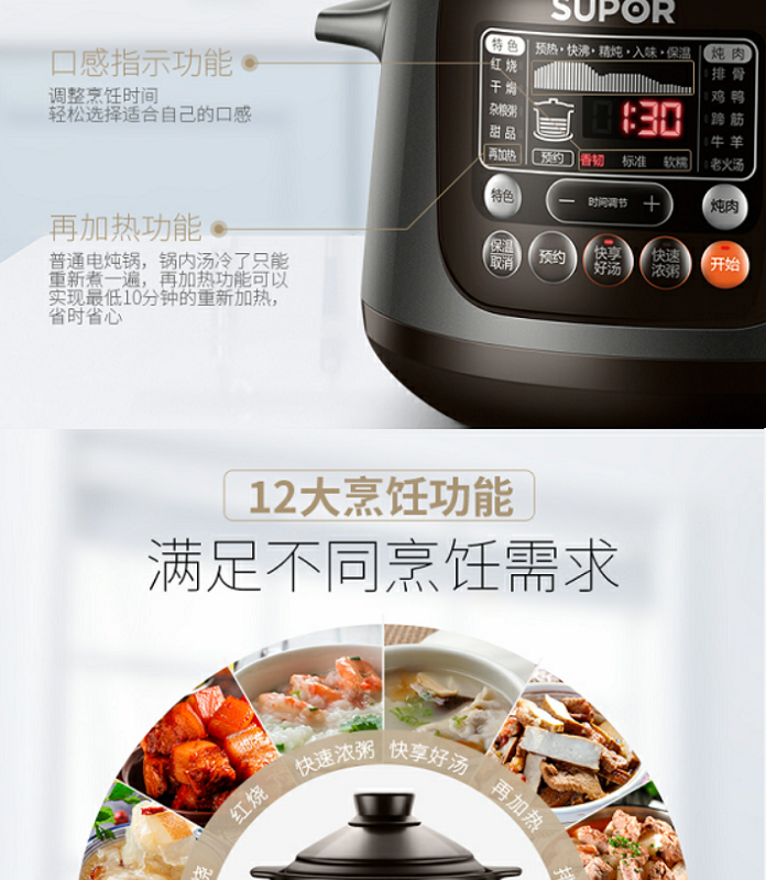 功能:特色(紅燒、干焗、雜糧粥、甜品、再加熱)燉肉(排骨、雞鴨、蹄筋、牛羊、老火湯)、快享好湯、快速濃粥、保溫、預(yù)約
