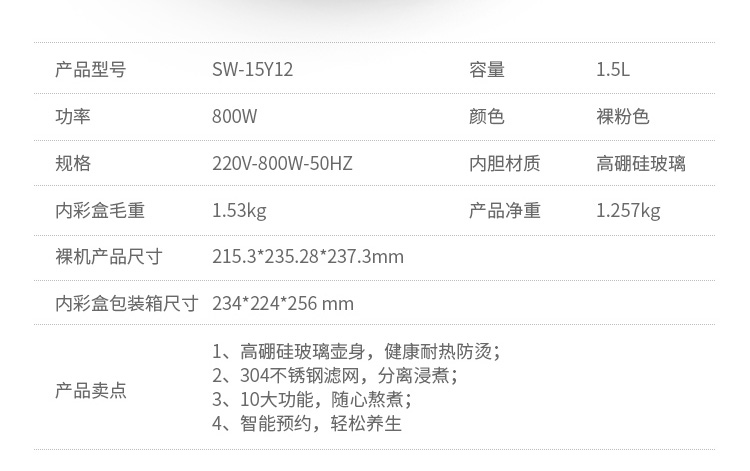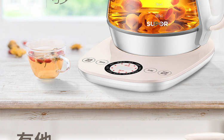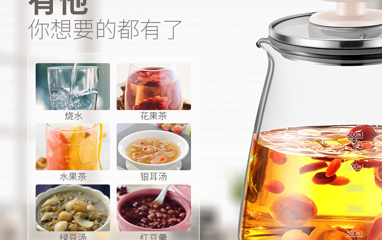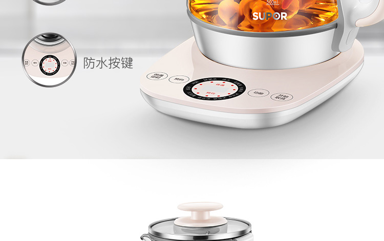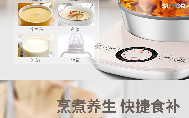 按鍵功能:除氯水、燒水、花果茶、水果茶、養(yǎng)生湯、銀耳湯、綠豆湯、紅豆羹、蟲草、沖奶、預約、保溫